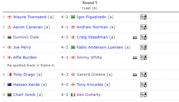 第一轮第二个比赛日,4冠王怀特以1-4爆冷输给阿尔菲-伯顿。达赫迪以2-4输给查尔-琼克,托尼-德拉戈4-3淘汰杰拉德-格林、哈桑·克拉德4-0横扫托尼-诺尔斯。那么,接下来还会有更多的冷门吗?